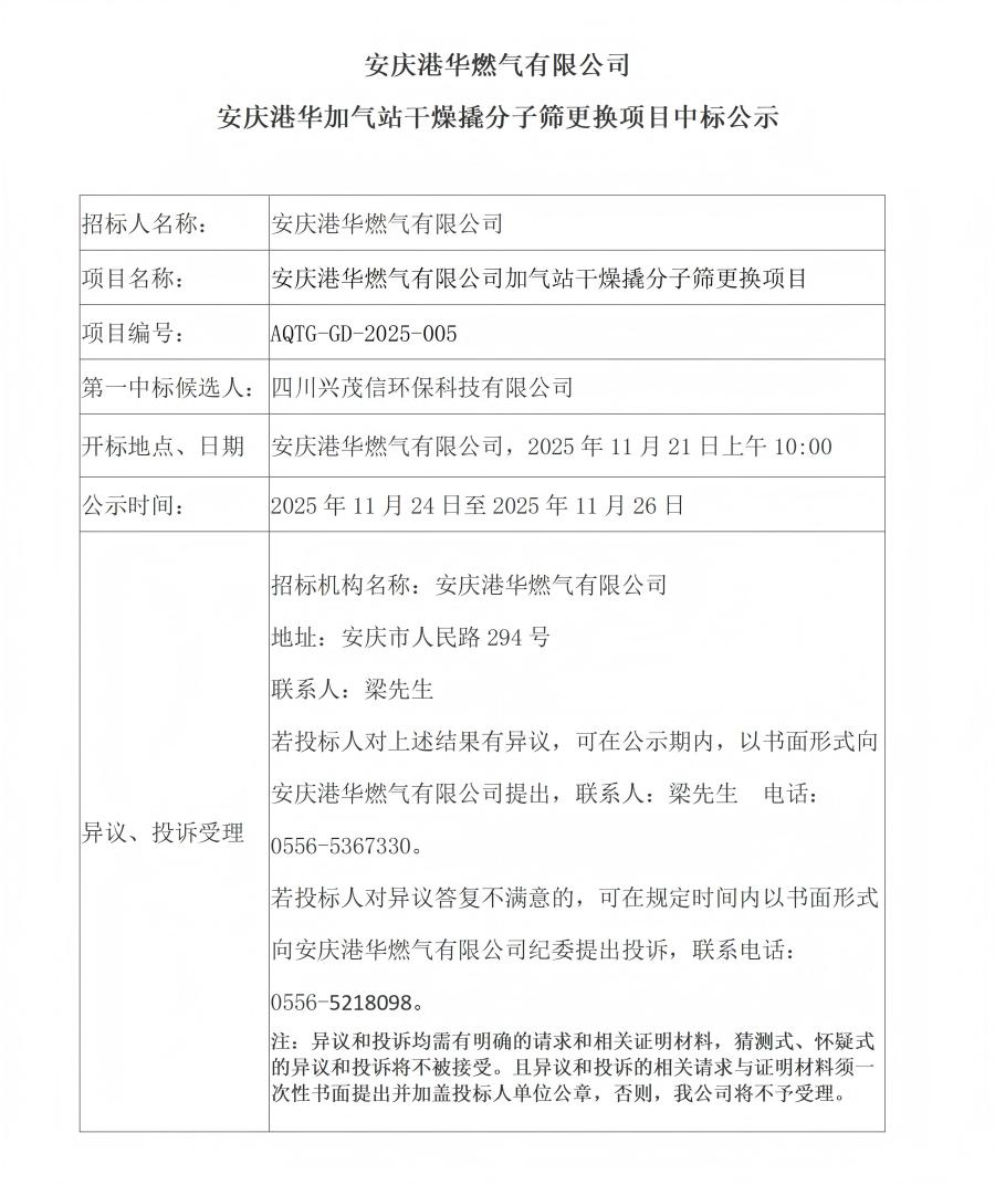 安慶港華燃?xì)庥邢薰景矐c港華加氣站干燥撬分子篩更換項(xiàng)目中標(biāo)公示